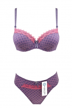 Бельевой комплект женский: бюстгальтер, трусы. Бюстгальтер с формованными чашечками и с косточками. Чашечки с пуш-апом. Застежка на крючок и петли сзади. Съемные бретели регулируются по длине. Бюстгальтер украшен кружевными вставками на чашечках и бантиком посередине. Трусы низкой посадки с эластичными мягкими резинками, украшены кружевной вставкой спереди и бантиком посередине.