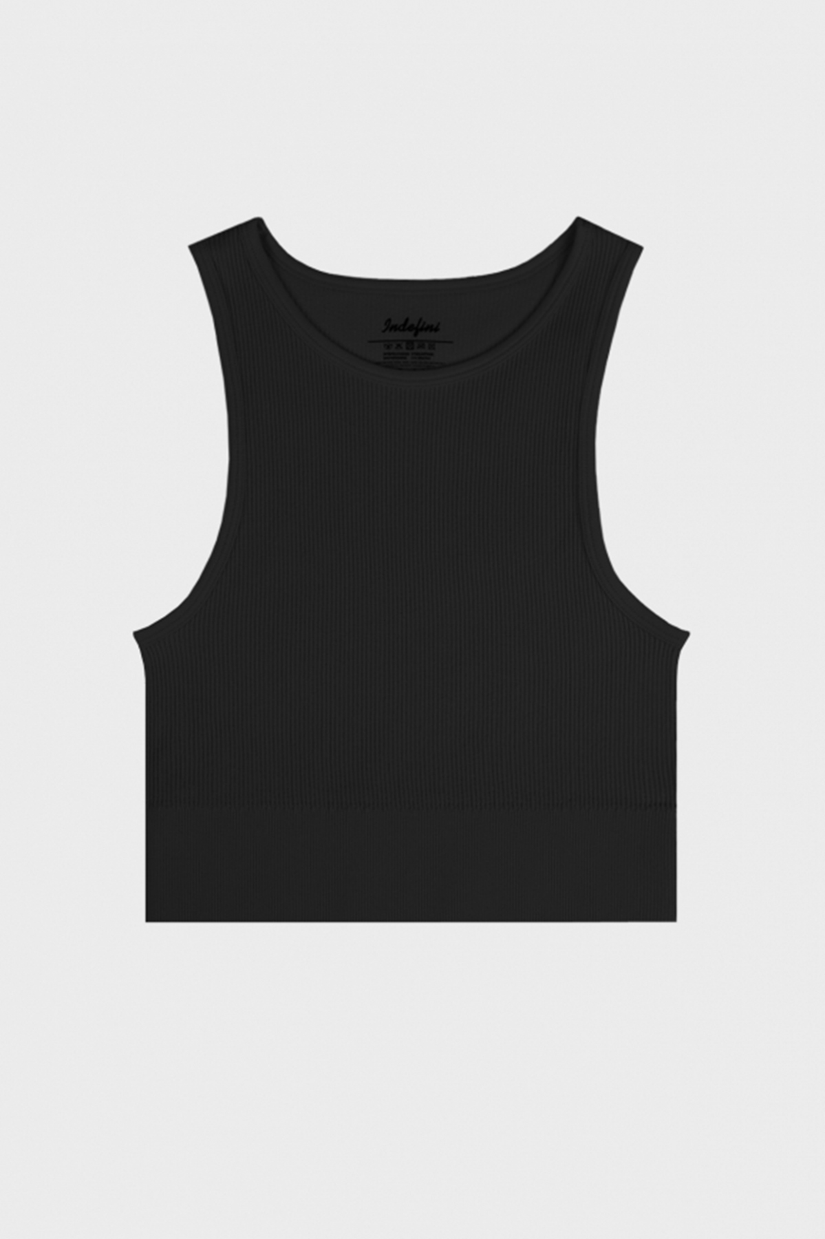 Майка-топ из полиамида, черного цвета, в рубчик, на резинке, укороченная.