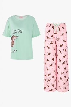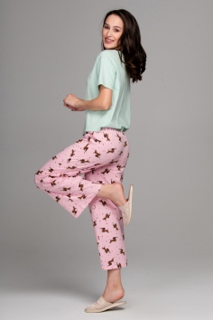 В комплекте футболка с брюками. Футболка из бамбука и хлопка, мятного цвета, с принтом, с короткими рукавами, прямая, свободного кроя. Брюки из хлопка, розового цвета, с принтом, прямые, свободного кроя, на мягкой резинке, с регулирующим шнурком.