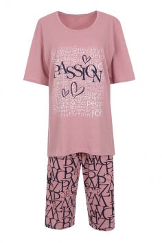 Женский костюм большого размера состоит из футболки и бридж. Футболка полуприлегающего силуэта с короткими рукавами и круглым вырезом горловины. Бриджи с эластичной резинкой в поясе и двумя внутренними карманами спереди. Приятная к телу ткань.