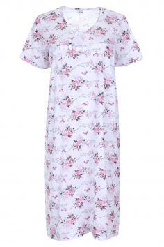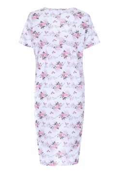 Женская ночная сорочка свободного кроя с коротким рукавом и цветочным принтом. Сорочка украшена бантиком посередине, нижняя часть полочки украшена цветами. Ткань мягкая и приятная к телу.
