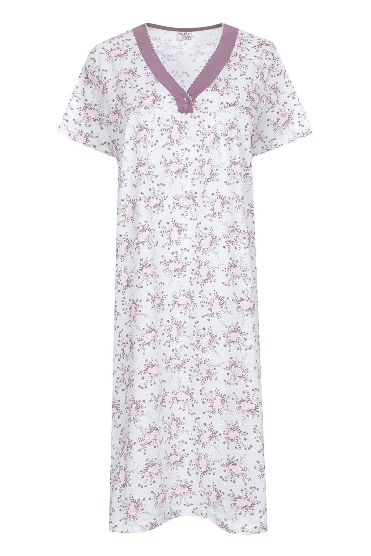 Женская ночная сорочка свободного кроя с короткими рукавами и V-образным вырезом горловины. Для обеспечения достаточной свободы нижняя часть полочки со сборкой. Ткань приятная к телу.