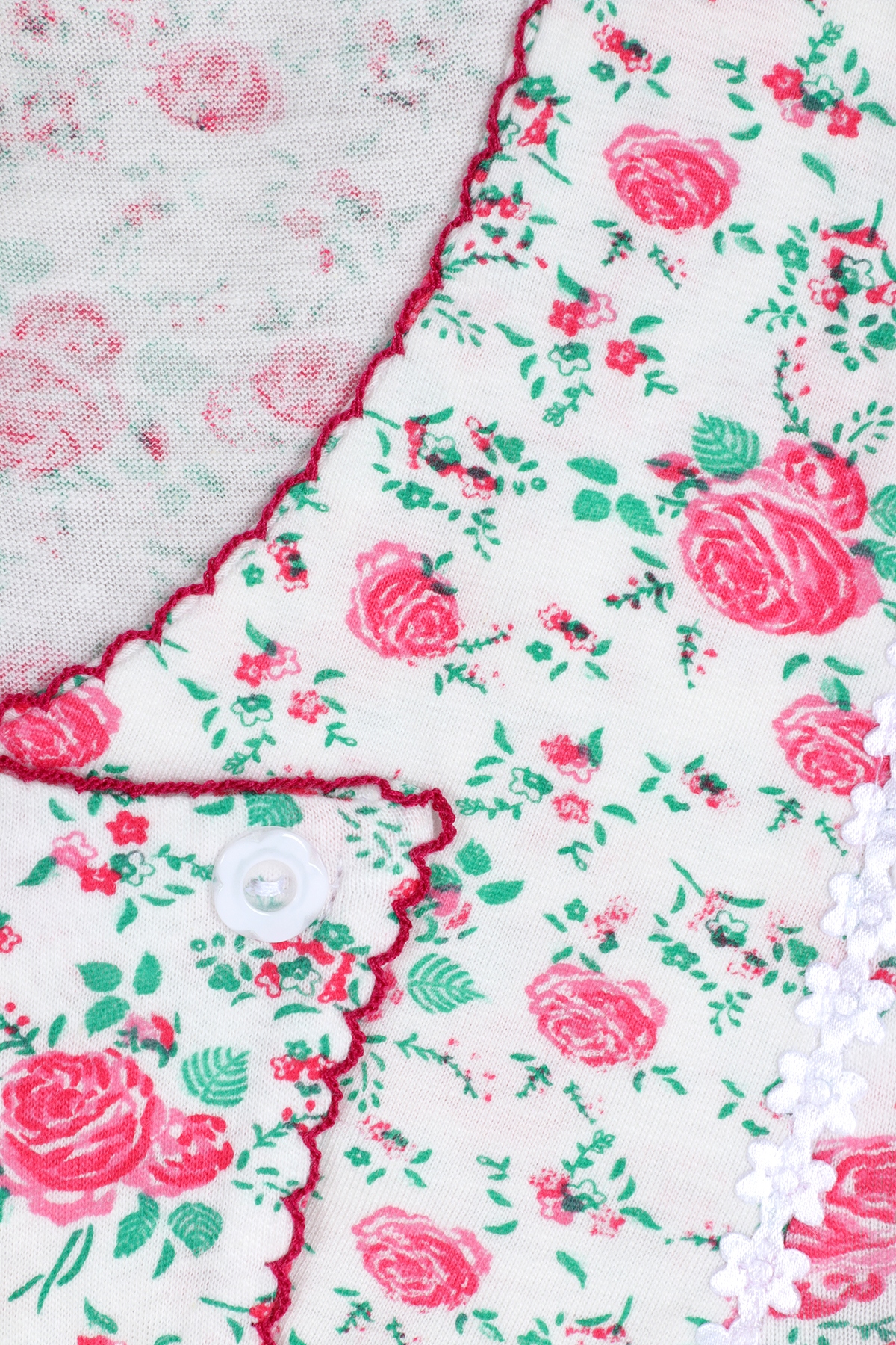 Женская ночная сорочка свободного кроя с короткими рукавами и V-образным вырезом горловины. Для обеспечения достаточной свободы нижняя часть полочки со сборкой. Сорочка украшена цветами. Ткань приятная к телу.