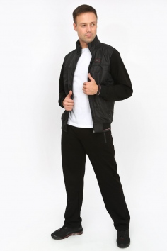 Мужской спортивный костюм выполнен из трикотажа с добавлением плащевки. Карманы брюк и кофты на молнии с декоративной листочкой. Низ и рукава кофты на манжетах, брюки прямого кроя, на талии резинка внутри которой находиться веревка для регулирования, воротник стойка. Костюм отлично подойдет для тренировок, для повседневной носки, дачи и дома.