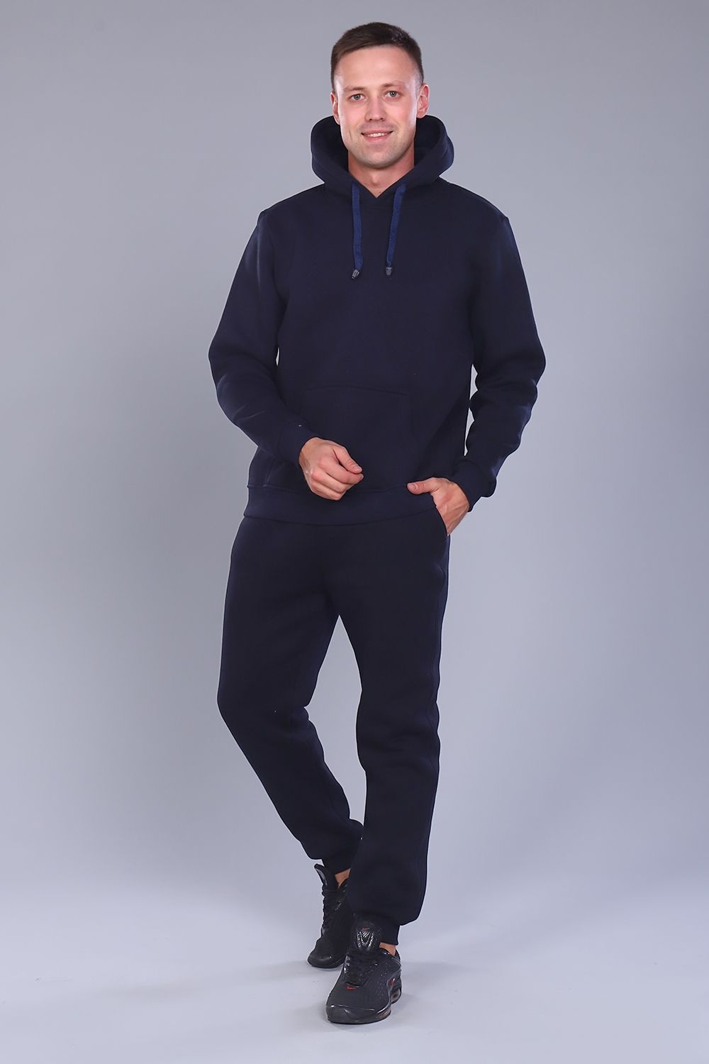 Теплый мужской костюм толстовка + брюки. Толстовка с капюшоном, без молнии, на животе карманы кенгуру, рукава и низ отделаны манжетами. Брюки с карманами, внизу манжеты. Несколько вариантов расцветки. Размеры от 46 до 54.