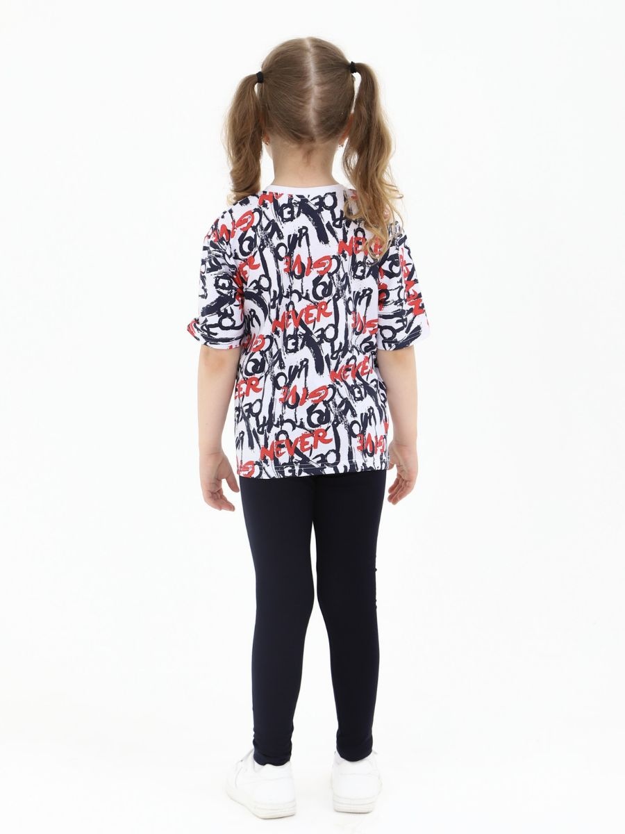 Костюм состоит из легинс с эластичным поясом и футболки. Футболка выполнена из высококачественного хлопка, что гарантирует комфорт и удобство в носке. Лосины выполнены из кулирки с лайкрой — эластичного трикотажного полотна, которое не стесняет движения.