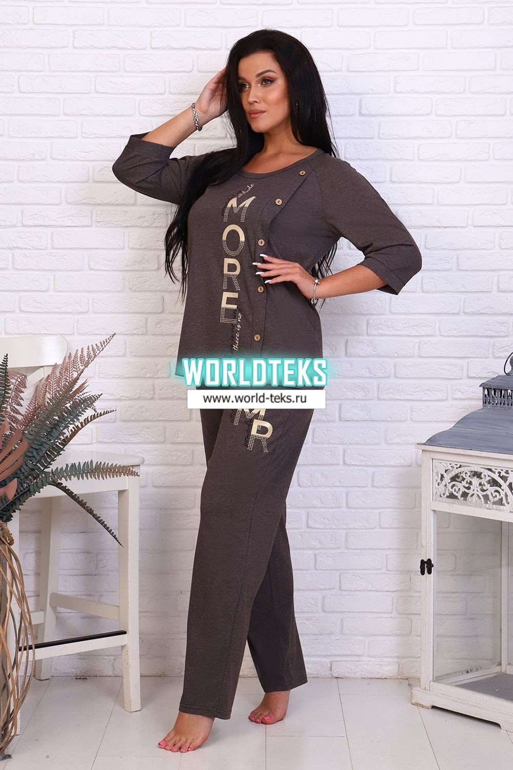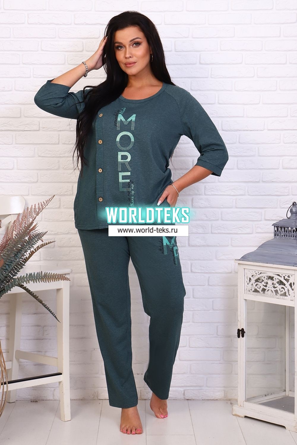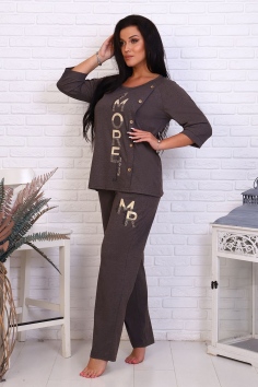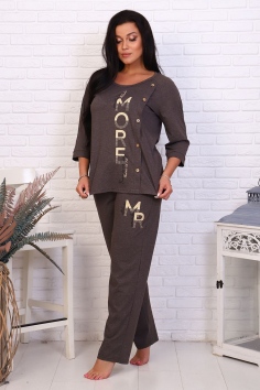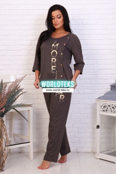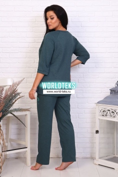 Костюм женский и кулирного полотна состоит из кофты и брюк. Кофта - прямой силуэт, горловина круглая, рукав 3/4 с манжетом, низ обработан на плоскошовной машине, на полочке отделка из декоративных пуговиц. Брюки - прямого кроя, верх на поясе с резинкой, в боковых швах карманы, низ брюк обработан на плоскошовной машине. На полочке и брюках принт.