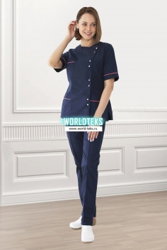 Отличный вариант красивой женской медицинской одежды для салонов красоты, больниц, медицинских центров, аптек, поликлиник и лабораторий. Стильный, легкий и удобный медицинский костюм выполнен из прочной и практичной смесовой ткани. Костюм с асимметричным кроем застегивается с помощью удобных кнопок и дополнен накладным карманом для мелочей. Он имеет стильную аскетичную горловину без воротника. Полуприлегающие прямые брюки декорированы стрелками. Костюм предназначен для медицинских работников и сотрудников СПА салонов.