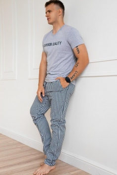 Домашний мужской костюм Майкл поможет расслабиться после тяжелого рабочего дня и насладиться домашним уютом. Домашняя мужская пижама в оттенках серого состоит из футболки с надписью на груди и брюк с привлекательной расцветкой в виде клетки создан из кулирки. Брюки на 100% состоят из хлопка, что позволяет им оставаться дышащими и легкими. Футболка на 50% состоит из хлопка и на 50% из полиэстера, что позволяет ей тянуться и не сминаться. Вы будете чувствовать себя уверенно, если внезапно придут гости или в дверь постучатся соседи. Будет незаменим в вашем гардеробе.
