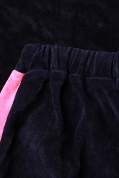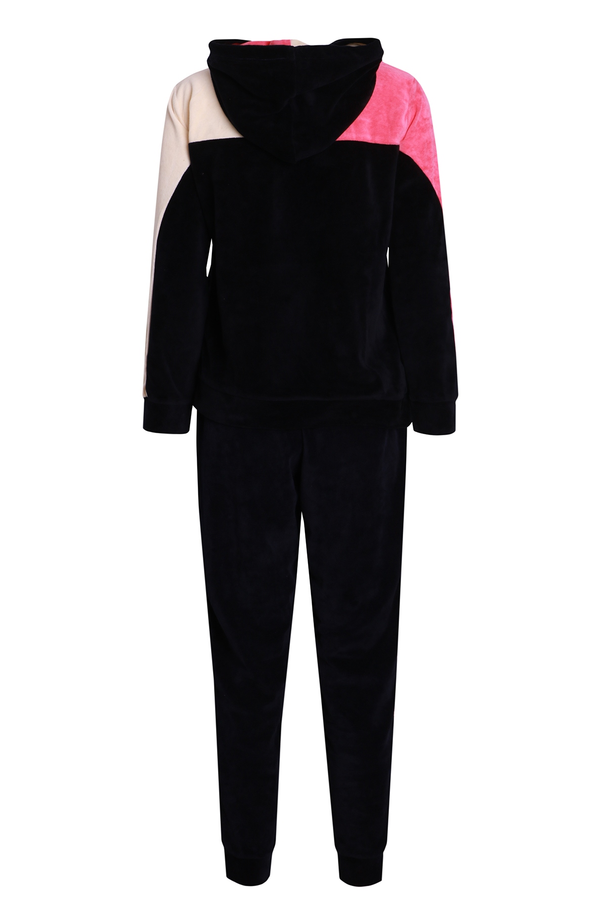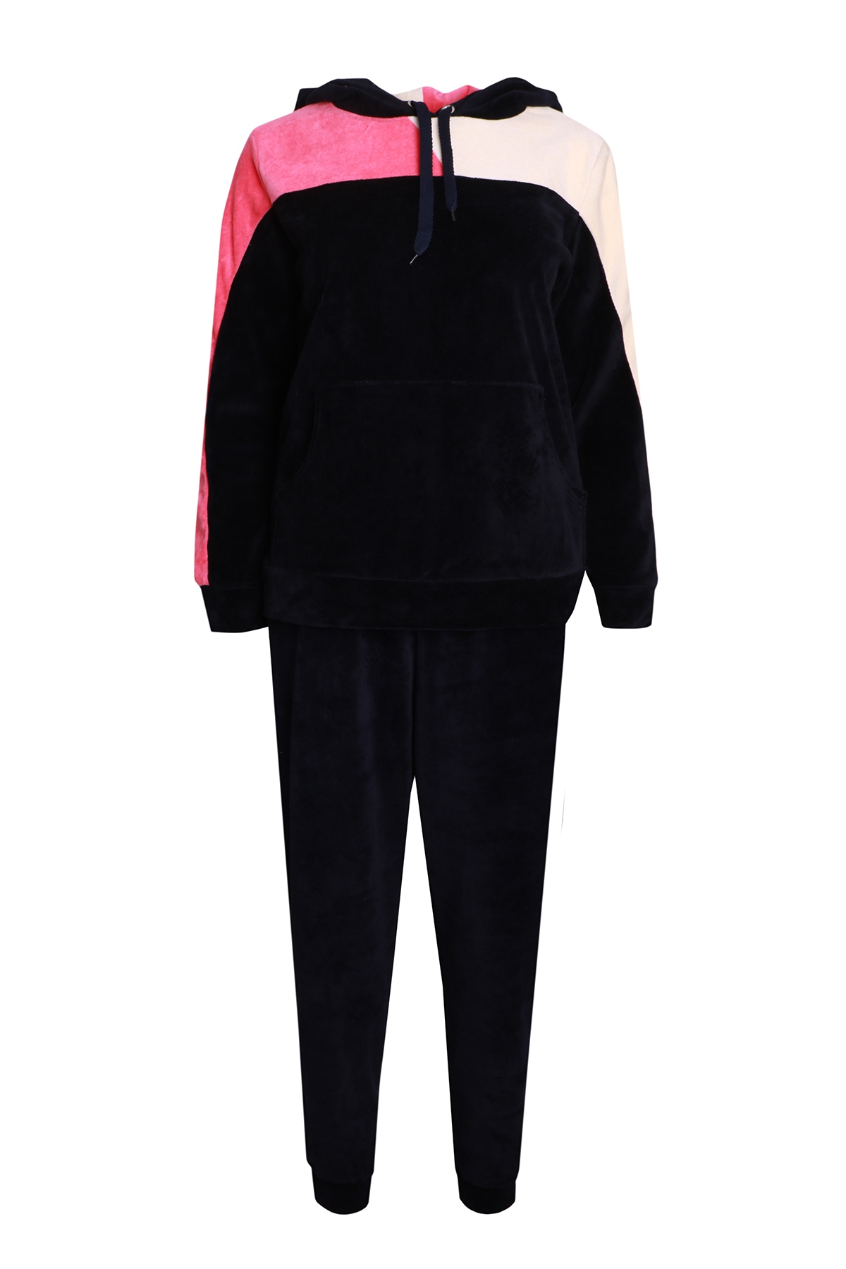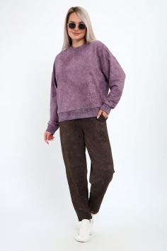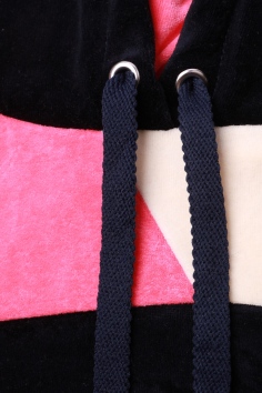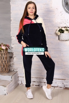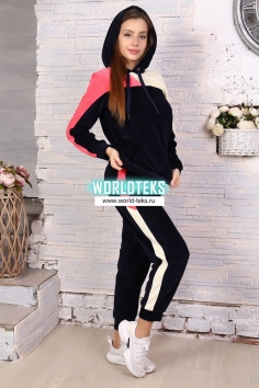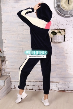 Женский костюм состоит из кофты и штанов. Кофта полуприлегающего силуэта с капюшоном. Штаны слегка заужены книзу, с эластичной резинкой в поясе и на щиколотках. Приятная к телу ткань.