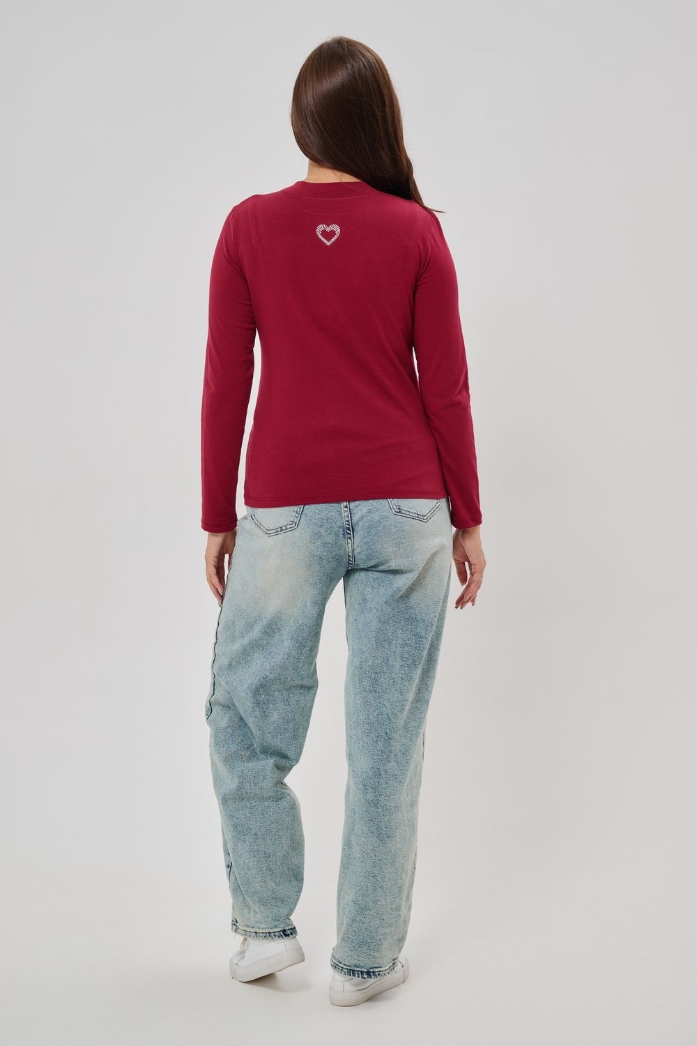 Женский лонгслив из высококачественной кулирки обладающий умеренно приталенным силуэтом и круглым вырезом горловины. Представлен в базовых однотонных цветах, имеет дополнительную градацию размеров для оптимальной посадки. Задняя сторона украшена орнаментом из страз в форме сердца. Универсальная модель для межсезонья, успешно гармонирует с разнообразными элементами гардероба различного стиля.