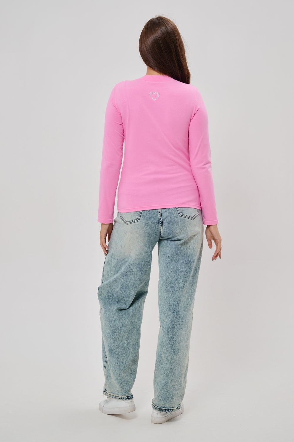 Женский лонгслив из высококачественной кулирки обладающий умеренно приталенным силуэтом и круглым вырезом горловины. Представлен в базовых однотонных цветах, имеет дополнительную градацию размеров для оптимальной посадки. Задняя сторона украшена орнаментом из страз в форме сердца. Универсальная модель для межсезонья, успешно гармонирует с разнообразными элементами гардероба различного стиля.