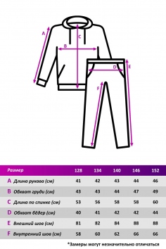 Размеры: 8 лет (128 см), 9 лет (134 см), 10 лет (140 см), 11 лет (146 см), 12 лет (152 см) - в скобках указан рост.