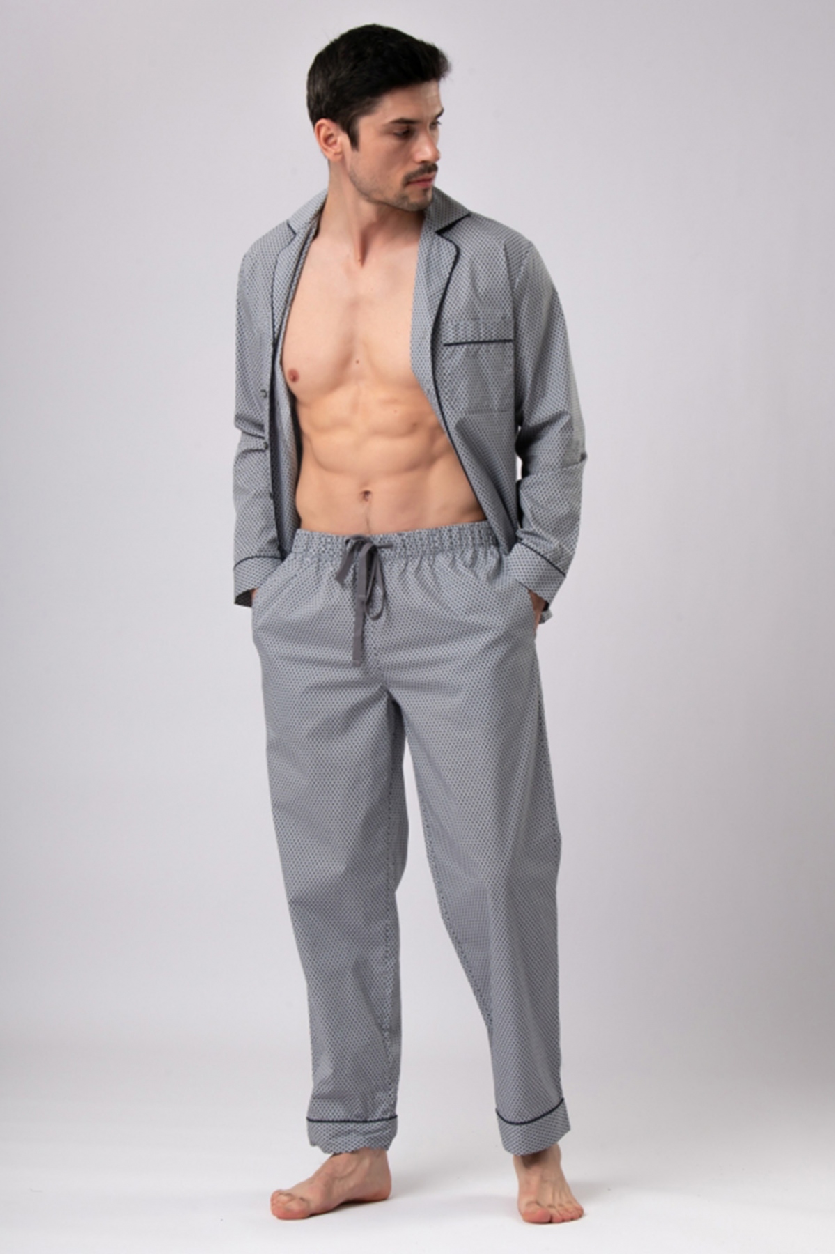 В комплекте рубашка с брюками. Рубашка из хлопка, серого цвета, с принтом, с длинными рукавами, с обрамлением, с кармашком на груди, с воротником-отворотом, на пуговичках, прямая, свободного кроя. Брюки из хлопка, серого цвета, с принтом, с обрамлением, с карманами, прямые, свободного кроя, с регулирующим шнурком, на мягкой резинке.
