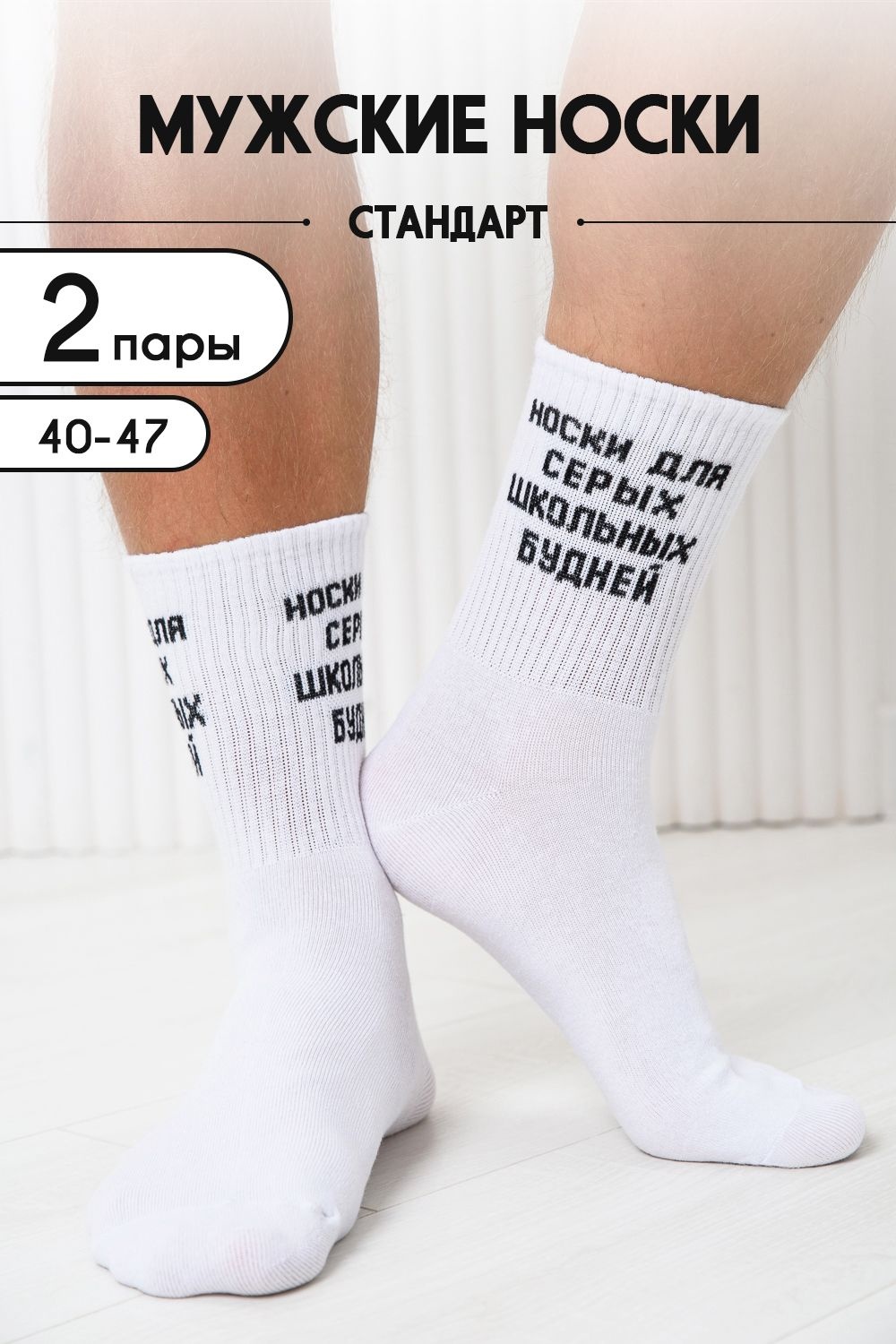 Комплект мужских носков 2 пары. Широкая резинка. По верхней части носка надпись 'Носки для серых школьных будней'