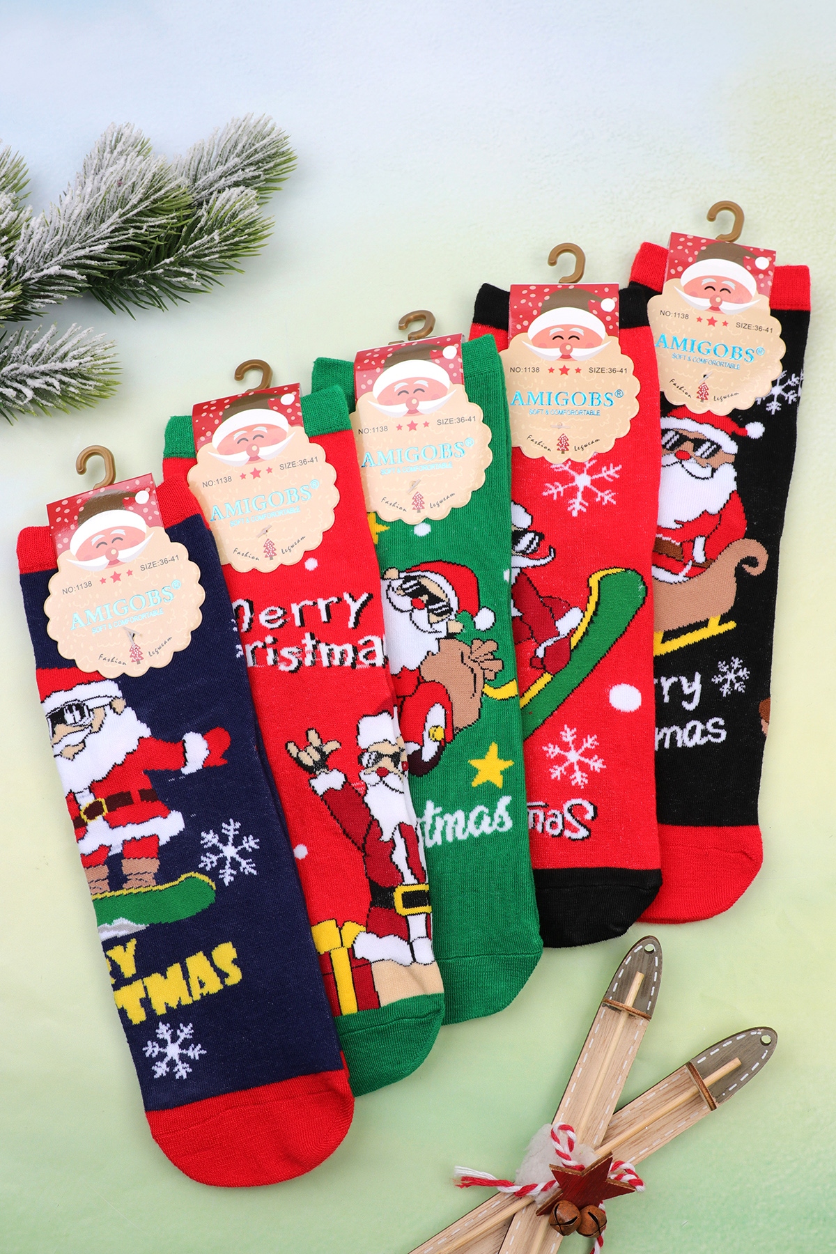 Новогодние носки средней посадки с удобной эластичной резинкой, которая не даёт носкам спадать и не сдавливает ногу. Носки выполнены из хлопка с добавлением синтетических волокон для лучшей посадки по ноге. Приятная к телу ткань.