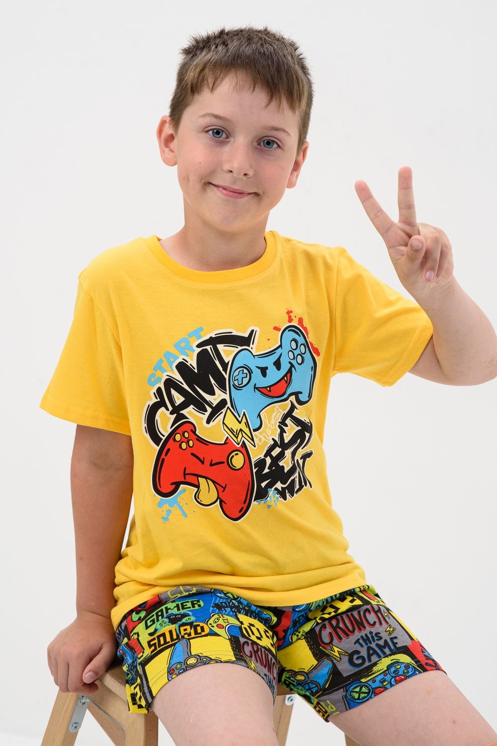 Пижама для мальчика, состоящая из футболки - однотонное полотно с нанесением печати и шорт - полотно с рисунком, выполнена из мягкой, приятной к телу трикотажной ткани средней плотности, 100% хлопок. Пижамка согревает, даже если ребенок ворочается и раскрывается во сне, а также создает ощущение уюта, ребенок спит глубже и реже просыпается. Также стильная пижама для подростков создает хорошее настроение. Можно носить как домашний костюм или использовать как летнюю пижаму, для дома или в садике. Пижамный костюм без карманов для полного комфорта во сне и застежек, свободного полуприлегающего силуэта, для комфортного сна ребенка. Пижамные шорты с удобной посадкой и нетугой резинкой. Яркий и модный молодежный пижамный стиль для детей и подростков, пижама для мальчика подростка.