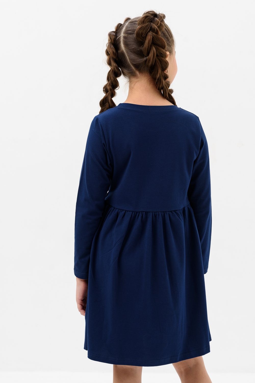 Платье для девочек дошкольного и младшего школьного возраста, из однотонного трикотажного полотна кулирка с лайкрой. Платье прилегающего силуэта, отрезное и расклешенное от линии талии, с втачным длинным одношовным рукавом, с обтачкой в горловине. Низа рукавов и нижней части платья подогнуты. По шву втачивания обтачки в горловину проложена отделочная строчка. Спереди на верхней и нижней частях платья нанесен печатный рисунок.