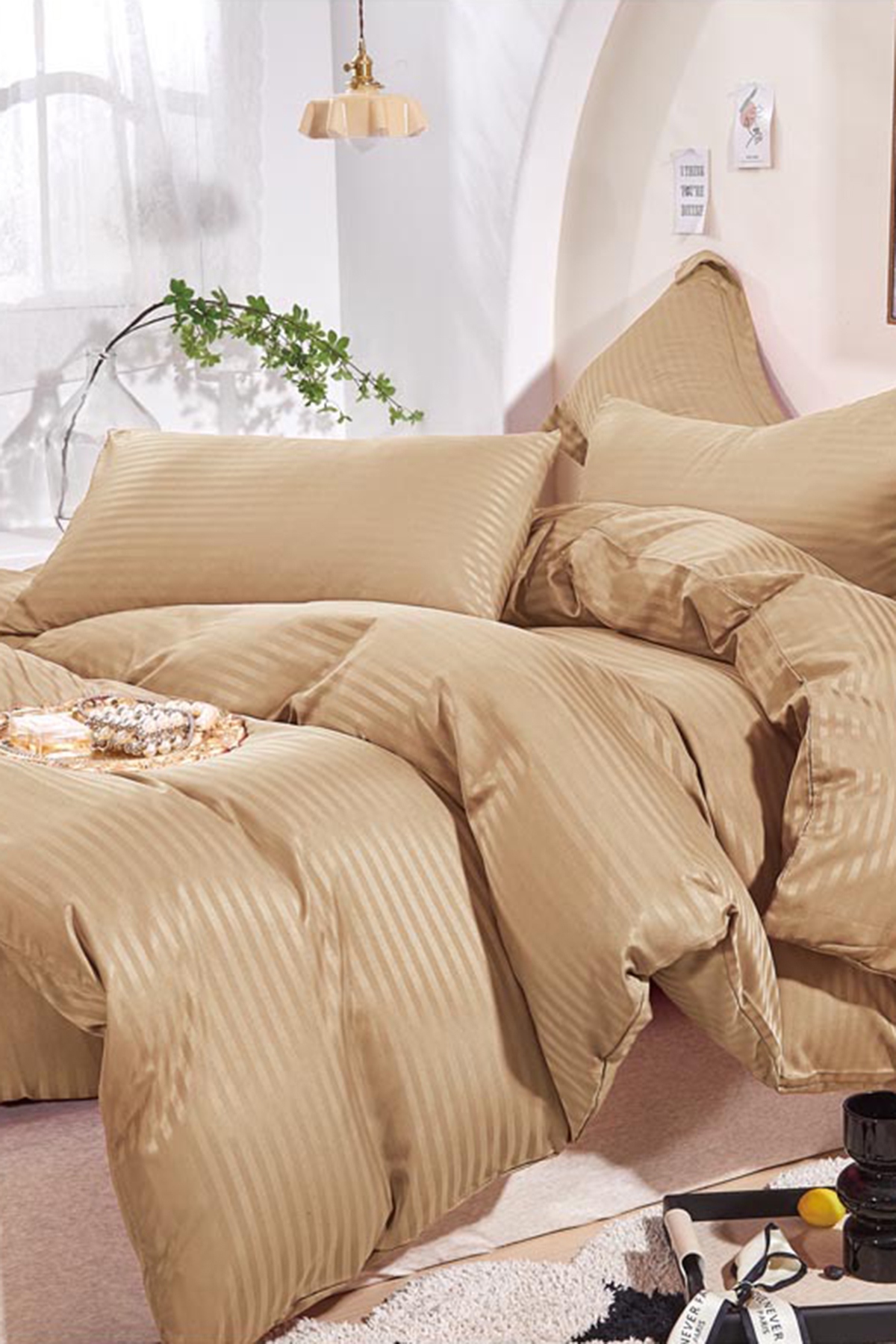 КПБ страйп-сатин с простыней на резинке (бежевый) №ПАВР-902-55