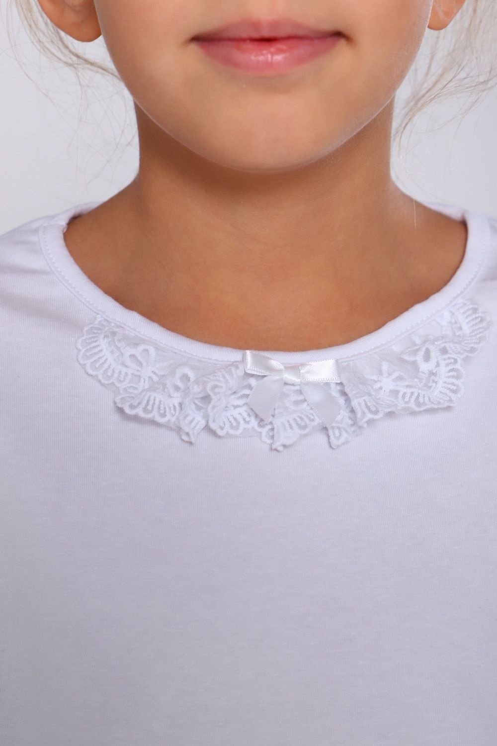 Базовая школьная блузка для девочек с длинным рукавом. Блузка прилегающего силуэта, с втачным рукавом. По центру переда настрочено жабо из кружева и прикреплен декоративный элемент. Нарядная блузка станет основой повседневного и праздничного образа. Модель составит одинаково удачный комплект и с юбкой, и с брюками. Блузка сшит из качественного трикотажа, используемый материал не теряет форму после многократных стирок, мягкий и приятный к телу, устойчив к износу. Для сохранения первоначальных свойств изделия, важно соблюдать рекомендации по уходу.