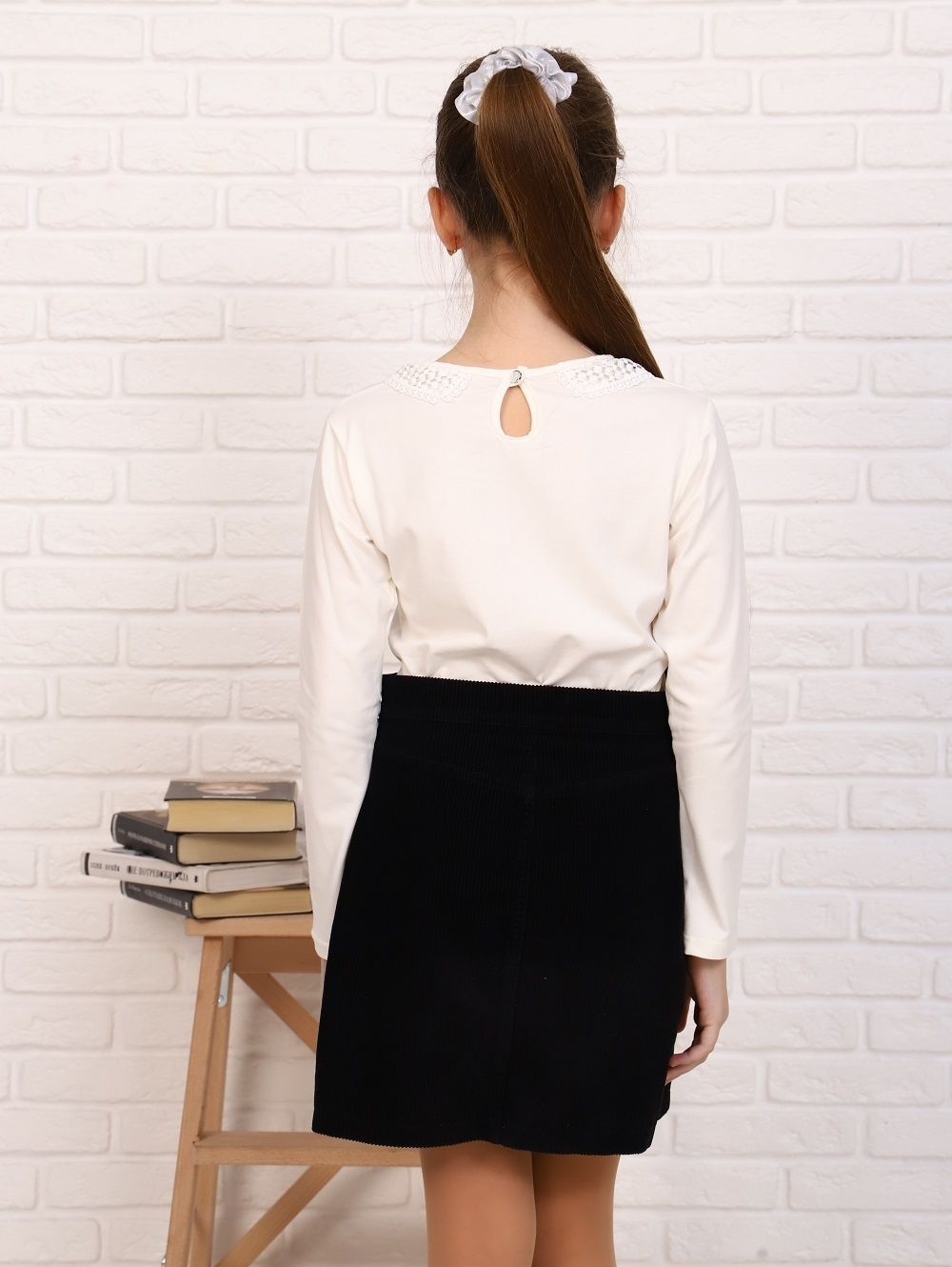 Блузка для девочек младшего и старшего школьного возраста, из трикотажного однотонного полотна – кулирка с лайкрой. Блузка полуприлегающего силуэта, с втачным длинным рукавом, с кружевным воротником, с центральной застежкой на петлю и пуговицу на спинке. Спереди отсутствуют линии членения. На спинке вырез в виде «капельки». Срез горловины и капля окантованы. Рукав одношовный. Низа рукава и изделия подогнуты. Спереди по центру горловины прикреплен декоративный элемент.