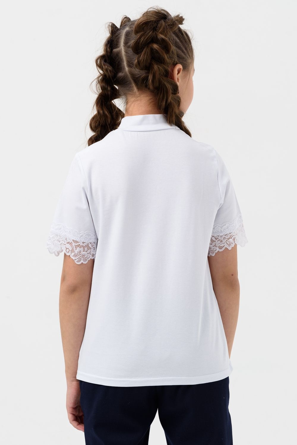 Школьная блузка для девочки с коротким рукавом. Мягкая трикотажная ткань и нежное кружево на рукавах и по переду изделия делают её универсальной - подходящей как для повседневной носки, так и для праздничных мероприятий. Узорчатый, полупрозрачный гипюр придаёт шарм этой модели. Модель составит одинаково удачный комплект и с юбкой, и с брюками. Воротник-стойка, несмотря на отсутствие застежки, хорошо тянется. Блузка сшита из качественного трикотажа, используемый материал не теряет форму после многократных стирок, мягкий и приятный к телу, устойчив к износу. Для сохранения первоначальных свойств изделия, важно соблюдать рекомендации по уходу.