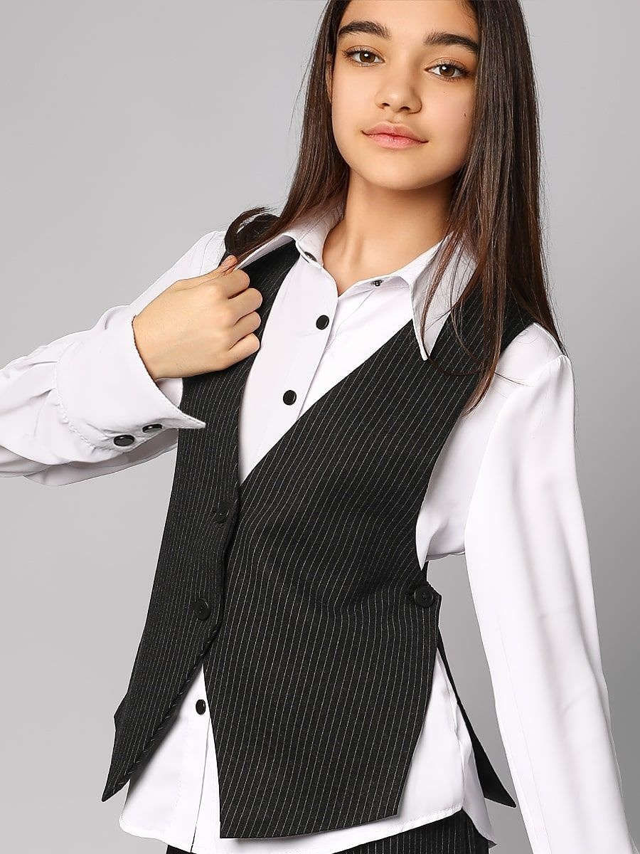 Классический, однобортный жилет для девочки Соль&Перец. Жилет с подкладом, выполнен из износостойкой трикотажной ткани которая долго сохраняет форму и привлекательный внешний вид. Жилет прекрасно сочетается с юбками и брюками. Подойдет для посещения школы, официального или праздничного мероприятия.