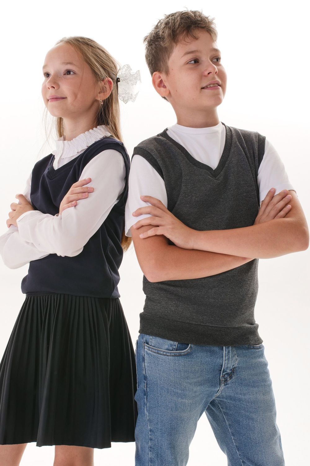 Классический жилет - универсальный предмет гардероба как для мальчика, так и для девочки. Он подойдет для множества школьных, а так же повседневных образов в стиле casual. Удачно сочетается с брюками и с джинсами, на девочках будет отлично смотреться с юбкой. Наша модель не сковывает движения, позволяя ребенку быть активным. Жилет выполнен из качественной турецкой ткани. Модель прямого силуэта, с V-образным вырезом. Горловина, манжеты и пояс выполнены из кашкорсе.