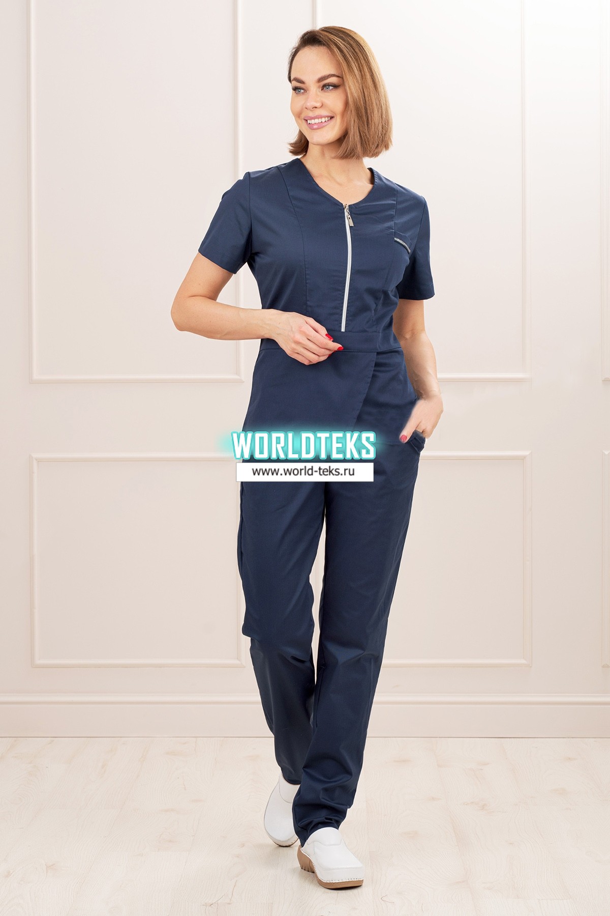 Костюм медицинский женский "Линда", прилегающего силуэта, состоит из куртки и брюк. Куртка имеет застежку – молнию, накладной карман и ассиметричный крой передних полочек. Брюки выполнены в классическом стиле. Использована качественная фурнитура. Костюм идеально садится по фигуре и подчеркивает ее достоинства. Костюм предназначен для медицинских работников и сотрудников СПА салонов.