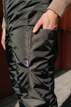 Полукомбинезон 1 класса защиты, с притачным утеплителем, с центральной застежкой на молнию, с бретелями, частично состоящими из эластичной тесьмы. Два накладных объемных кармана с клапанами, застегивающимися на контактную ленту. Спинка с эластичной тесьмой по талии.