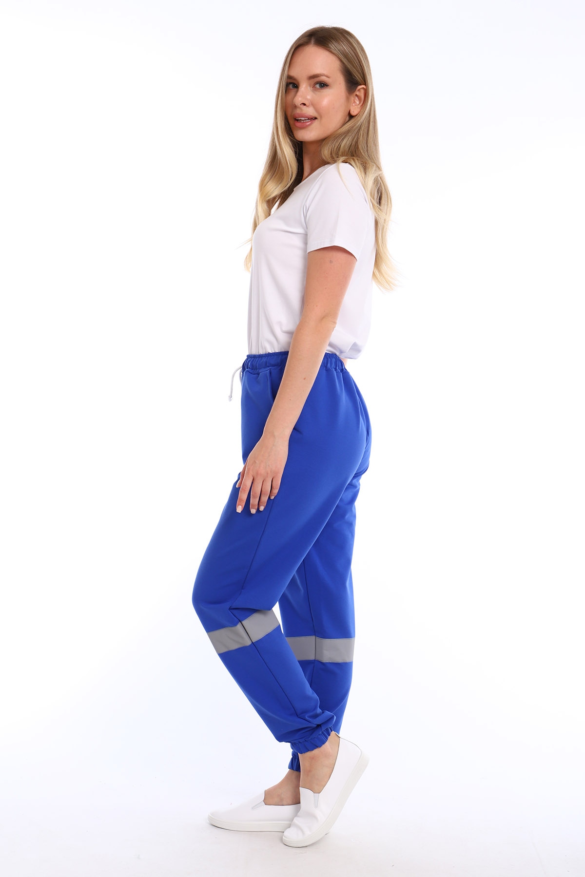 Брюки женские летние для работников скорой помощи со светоотражающей полосой. Пояс на резинке регулируется шнурком, в передней частибрюк два косых боковых кармана. Низ брюк собран на эластичную ленту, что делает ее профессиональным предметом одежды для работников скорой помощи.
