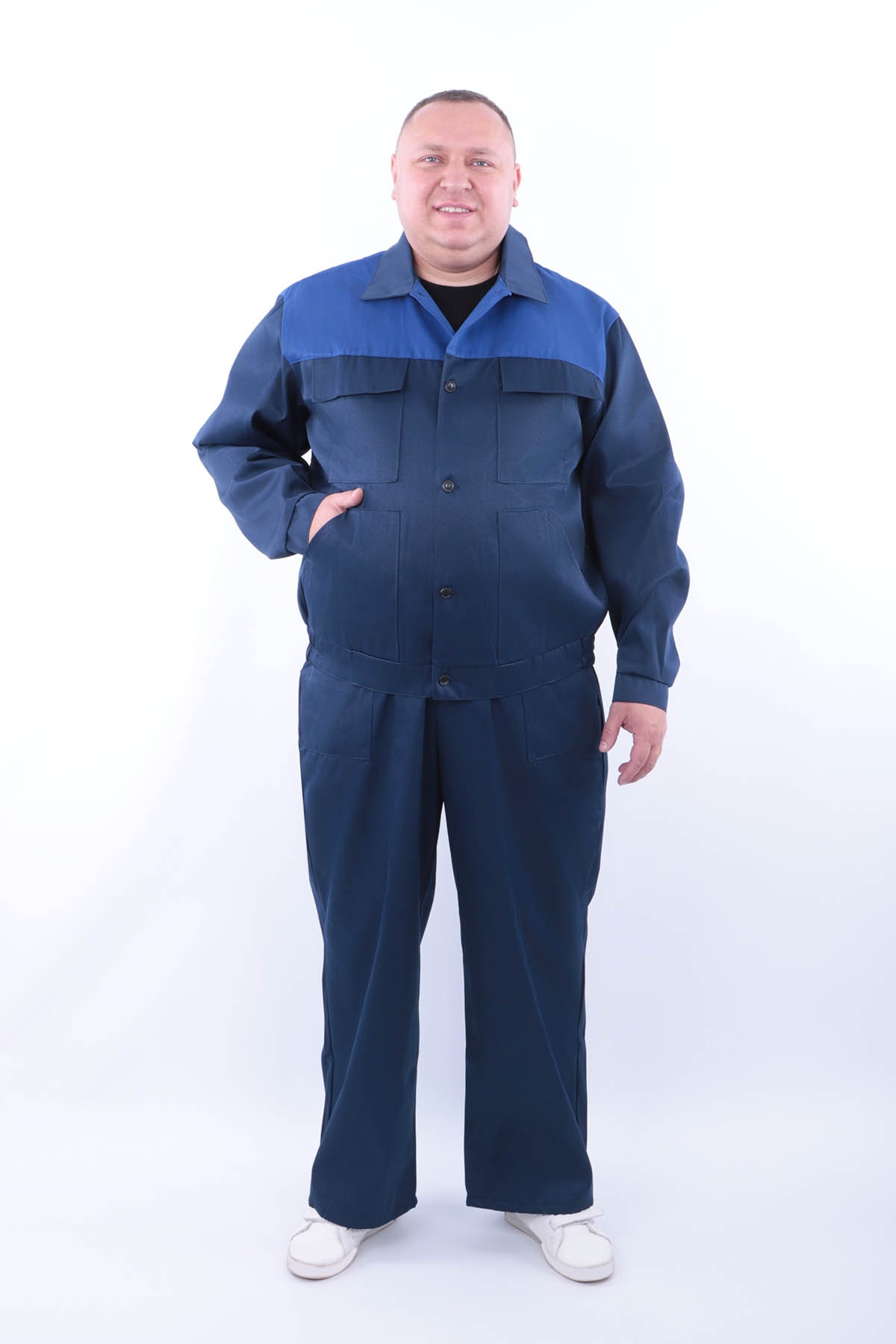 Костюм рабочий для мужчин стандарт - это классический вариант спецодежды для мужчин в демисезонный и летний период года. В комплект формы входят полукомбинезон и спецовка из хлопкового волокна с добавлением полиэстера. Спец одежда мужская - рабочий костюм предусмотрен для работы на производстве или на стройке, в сервисной службе и в автосервисе, а также для других рабочих специальностей. Куртка от униформы удлиненная имеет прямой силуэт с 2 боковыми и 2 нагрудными накладными карманами, застегивается на пуговицы, модель с отложным воротником. Полукомбинезон с 2 боковыми функциональными карманами для инструментов, и один нагрудный карман.
