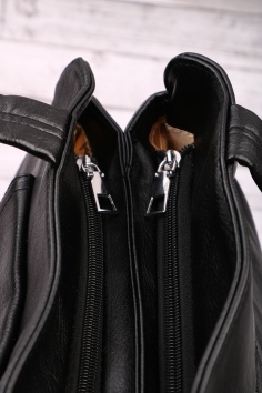 Внутри большой и потайной карманы на молнии, карман под телефон и всякую мелочь. Спереди карман на молнии и на заклёпке. Сзади карман на молнии.