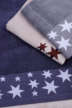 Мягкое, махровое полотенце из хлопка украшено орнаментом звезды. Махровая ткань хорошо впитывает влагу и приятна к телу.