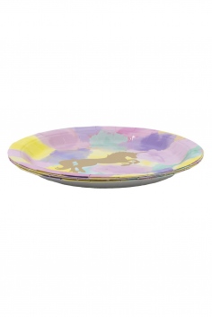 Стильная круглая бумажная тарелка с золотым фольгированным тиснением в форме Единорога. Используется совместно с другими элементами коллекции как украшение стола или по своему непосредственному назначению.
