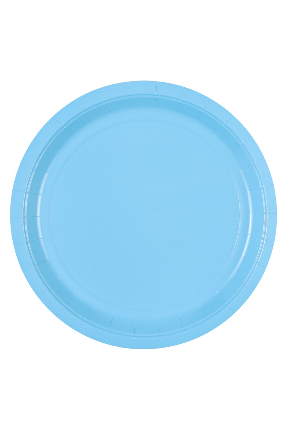 Бумажная тарелка голубого цвета. Используется совместно с другими элементами коллекции по дизайну (стаканы, приборы, скатерти и т.п.).