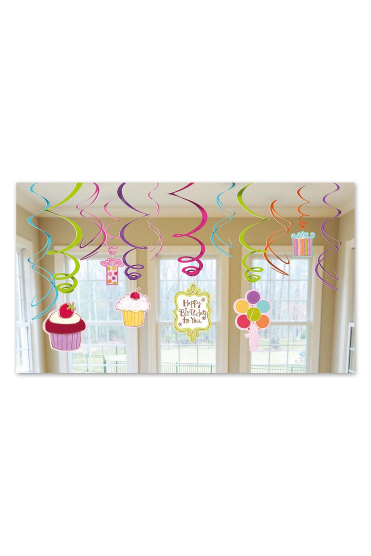 Декорация в виде фольгированных спиралей с подвешенными баннерами в форме кексов, воздушных щаров, подарков и поздравления Happy Birthday to You - декоративное украшение интерьера.