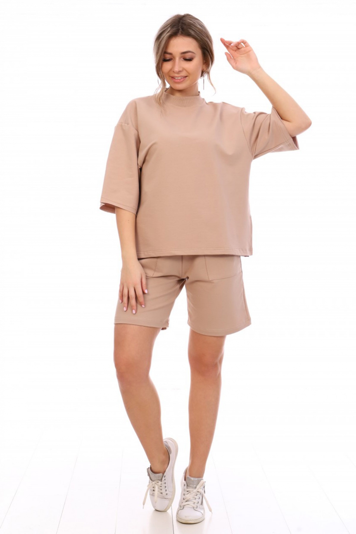 Свитшот оригинального кроя с вырезами по низу боковых швов, горловина «труба» из эластичного кашкорсе. Шорты - бермуды с завышенной талией и накладными карманами. Характеристичный комплект кроя оверсайз, в стиле спорт шик, комфортен для повседневной носки. Изготовлен из мягкого и дышащего, но при этом практичного полотна.