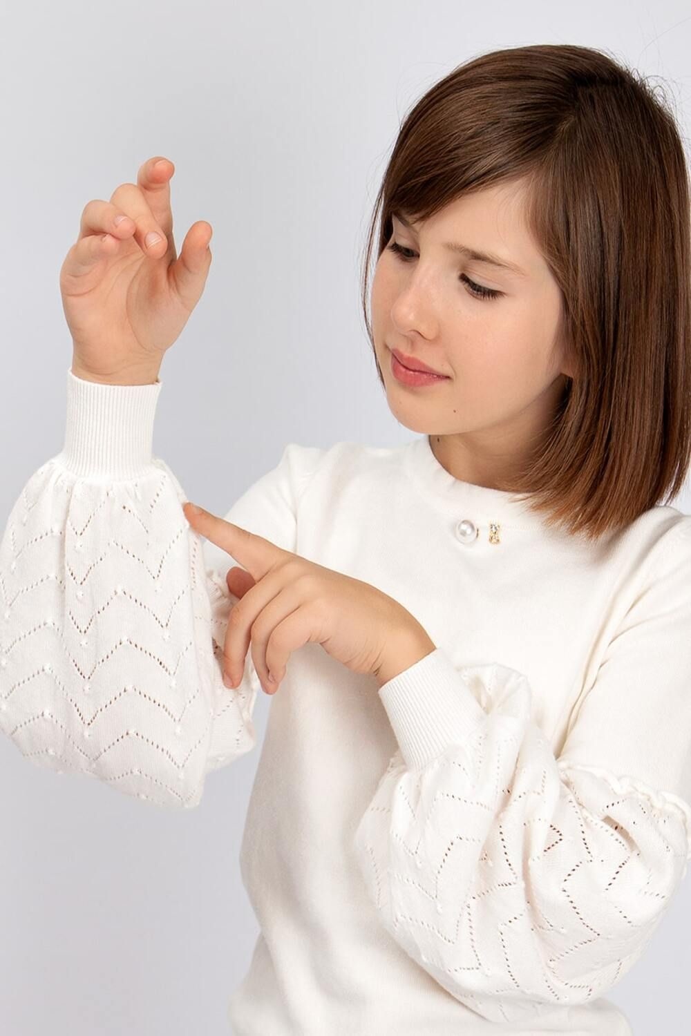 Элегантный джемпер для девочки, декорированный брошью - бусиной со стразами. Мягкий, вязаный трикотаж не сковывает движений, обладает хорошей воздухопроницаемостью и приятно облегает тело. Джемпер прекрасно сочетается как с юбками, так и с брюками. Подойдет для посещения школы, официального или праздничного мероприятия.