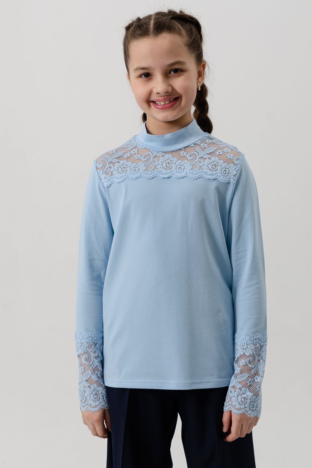 Блузка для девочек младшего и старшего школьного возраста, из трикотажного полотна – однотонная кулирка с лайкрой и кружева (дизайн и ширина кружева может меняться). Блузка прилегающего силуэта, с втачным рукавом, с воротником – стойкой. Спереди отрезная кокетка из кружева. На спинке отсутствуют линии членения. Рукав длинный одношовный. По низу рукава настрочено широкое кружево. Низ изделия подогнут.