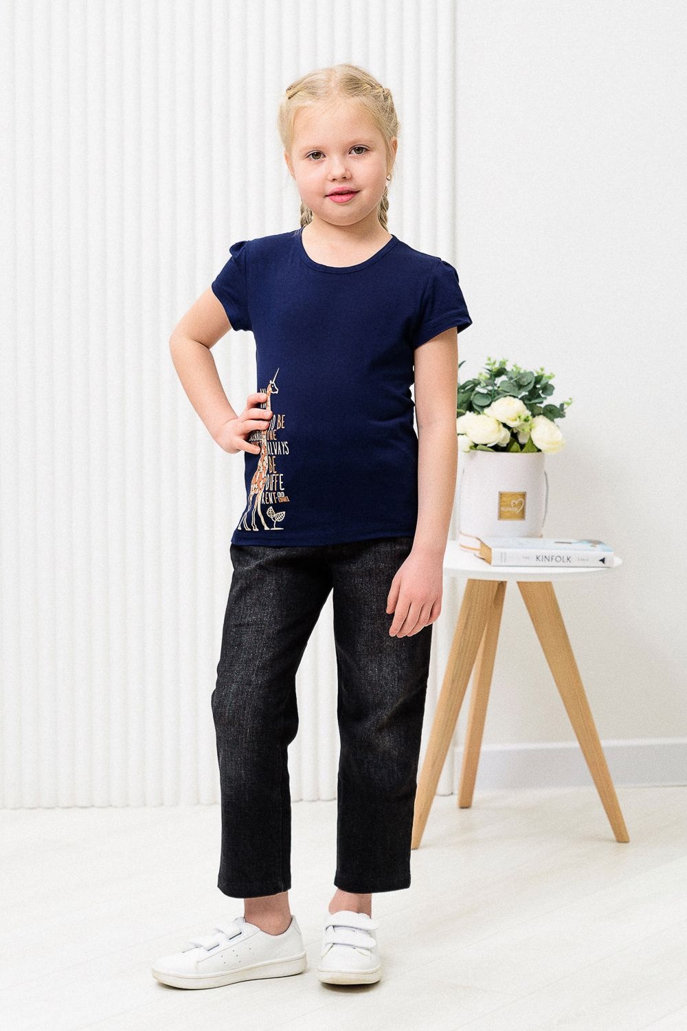 M124 футболка для девочки, их хлопкового полотна кулирка. На нижней части принт в виде жирафа.