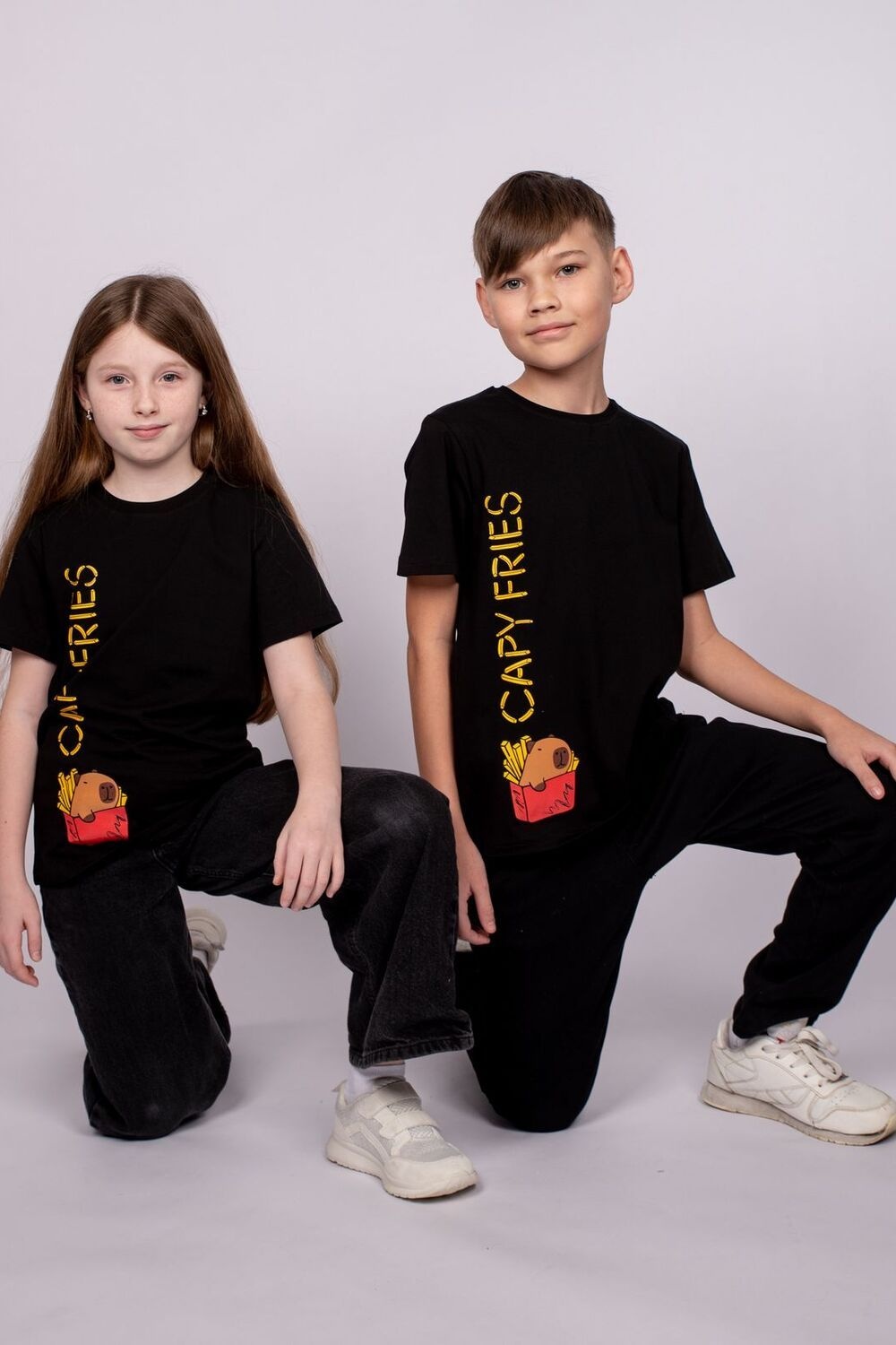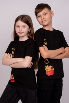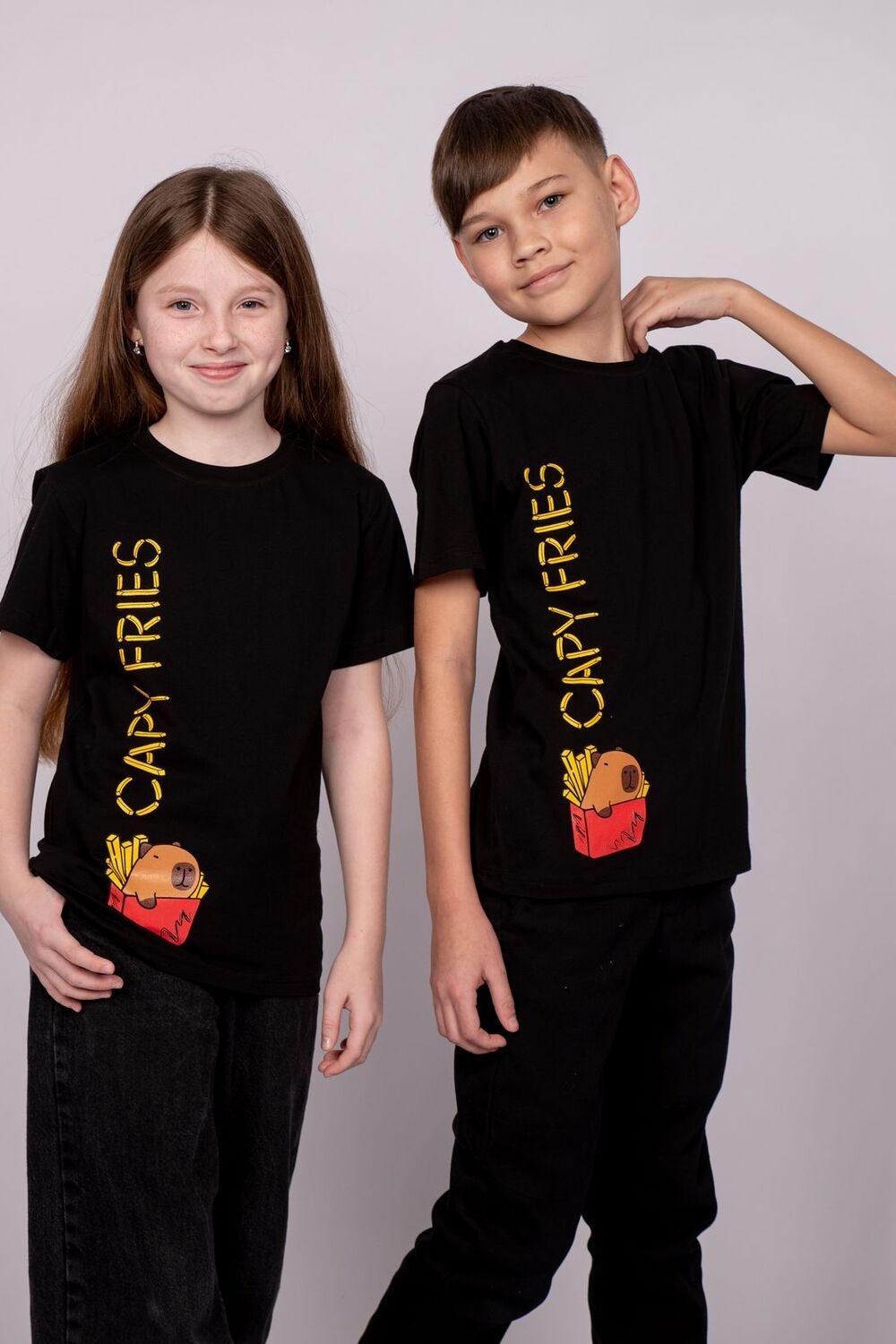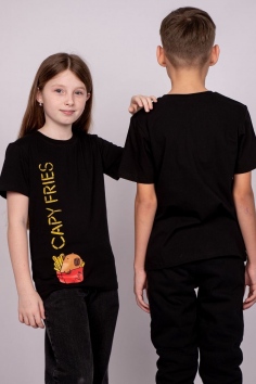 Футболка детская прямого силуэта с втачным коротким рукавом. Горловина обработана рибаной. Росток спинки обработан бейкой из кулирки. На полочке принт ШЕЛКОГРАФИЯ