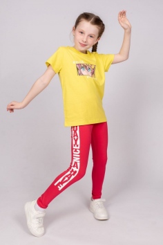 Футболка для девочки прямого силуэта, с втачным коротким рукавом. Горловина круглая, обработана воротником из рибаны. По горловине полочки отделочная строчка. Низ изделия и рукава обработан швом вподгибку. На полочке принт Шелкография с глиттером. Надпись переводится как 'Будь счастлива, красота в её глазах'.