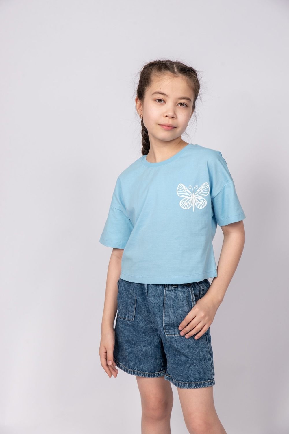 Футболка для девочки укороченная выполнена из 100% хлопка. Футболка прямого силуэта, со спущенным плечом, коротким рукавом. Благодаря эластичной горловине, выполненной из рибаны, футболку удобно снимать и надевать. На полочке принт Шелкография со вспенкой. Материал не растягивается и не деформируется.