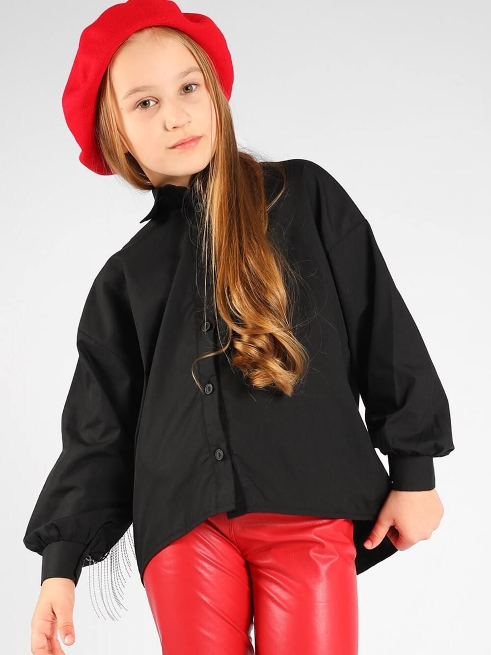 Блузка для девочки Соль&Перец, модель оверсайз, на пуговицах. Удлиненная спинка с эффектным декором, рукав-реглан, линия плеча приспущена. Блузка прекрасно сочетается как с брюками, так и с юбкой, подчеркнет индивидуальный стиль девочки, и разнообразит ее повседневный школьный образ.