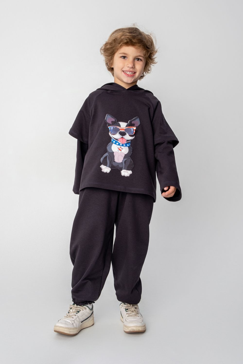 Костюм из мягкого футера двунитки. Свободный крой, стильная худи с капюшоном, прямые брюки с боковыми карманами. Подходит для прогулок, садика, а также для дома. Легкий в уходе, после стирки не деформируется и не пилингуется.