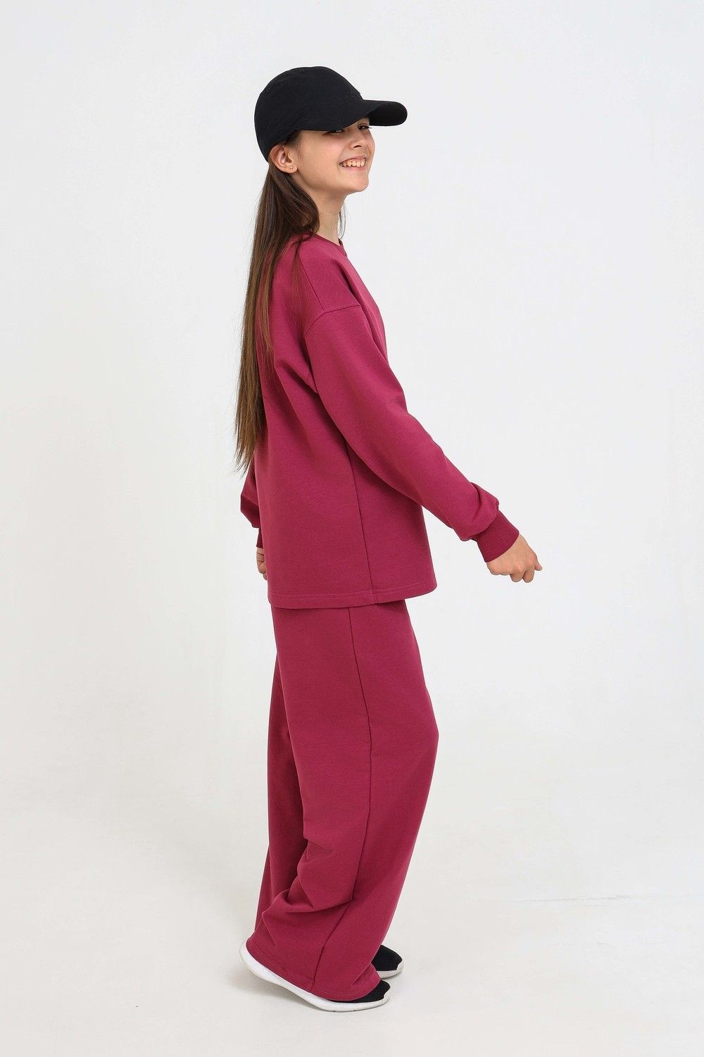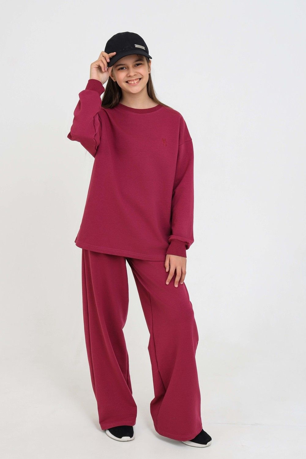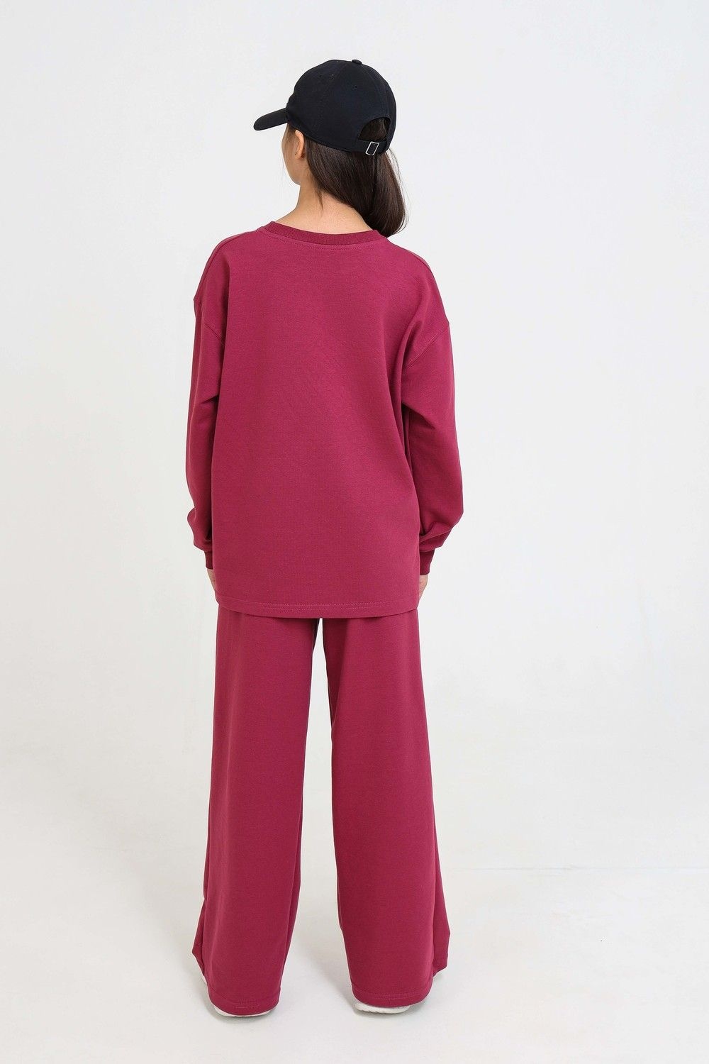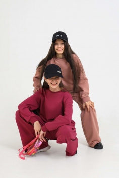 Спортивный костюм из футера мастхэв в детском гардеробе. Состоит их брюк-клёш и свитшота. Свитшот свободного кроя. Манжеты и горловина обработаны мягким кашкорсе. Брюки палаццо с карманами по бокам с поясом на мягкой резинке.