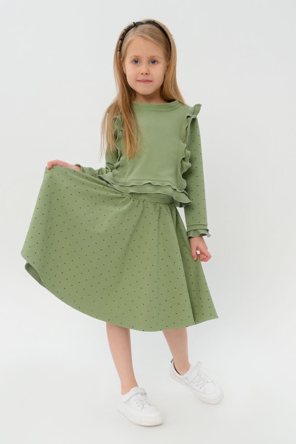 Костюм состоит из лонгслива и юбки, которые имеют узор в мелкий темный горошек. Выполнен из набивного футера, который легок в уходе и стирке. Костюм подойдет как для повседневной носки, так и для особых дней.