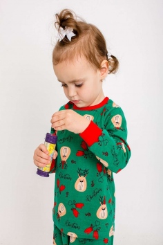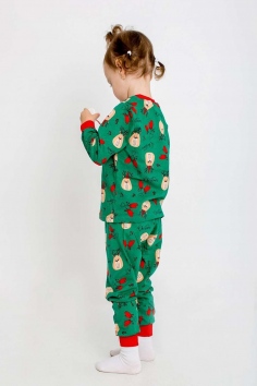 Пижама состоит из джемпера и брюк, из набивной кулирки. Джемпер с удлиненными втачными рукавами. Обтачка горловины и манжеты рукавов из рибаны. В поясе брюк эластичная резинка, манжеты из рибаны.