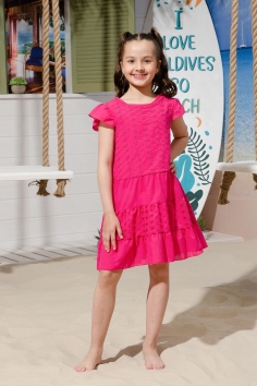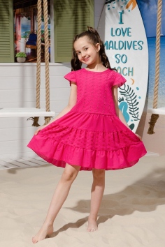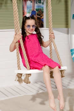 Платье детское, расширенное к низу. Рукав 'крылышко'. Горловина округлая, сзади завязки. Три яруса платья из тканей компаньонов. Платье из шитья, в состав которого входит 100% хлопок, ткань комфортна и гигроскопична.
